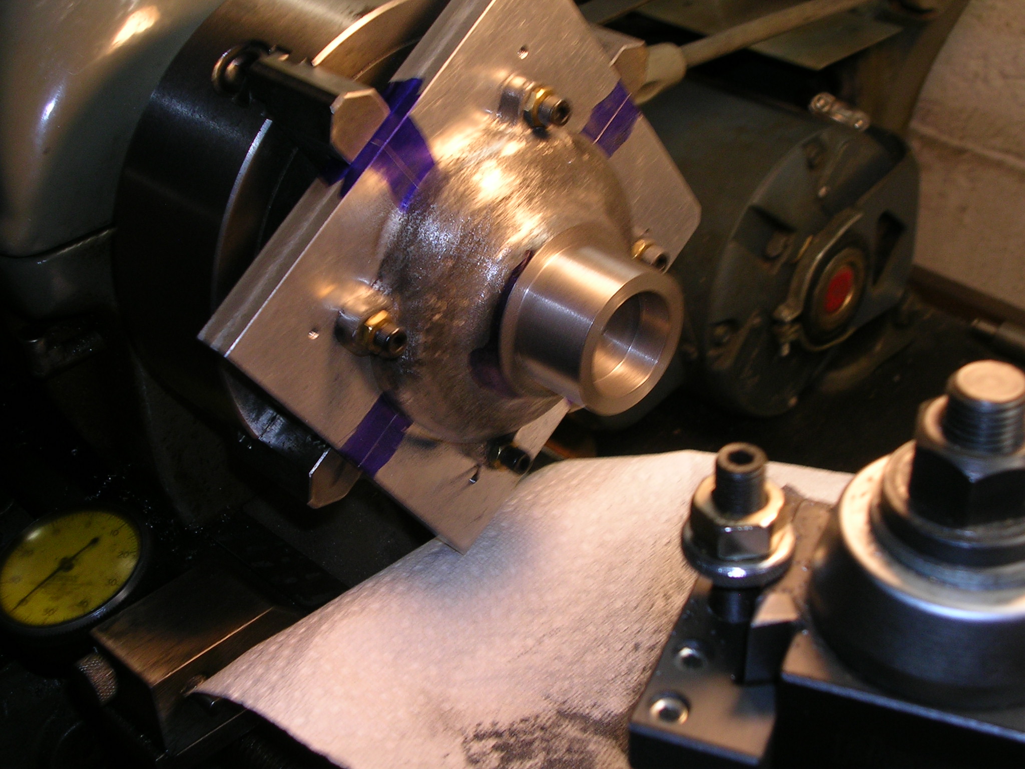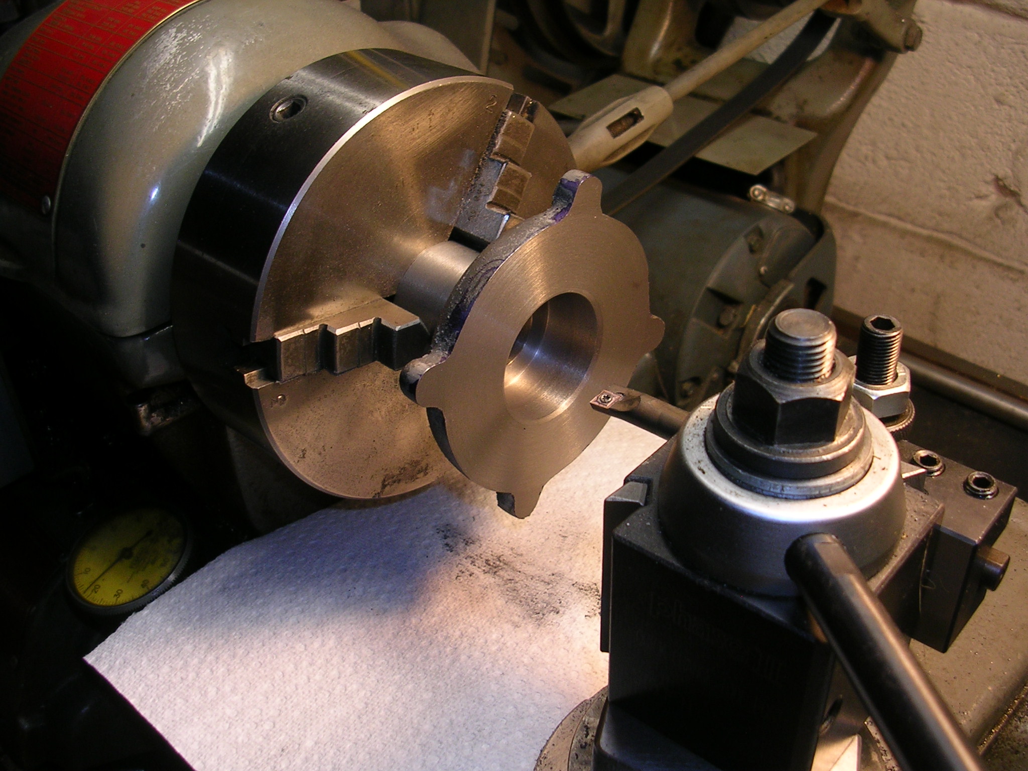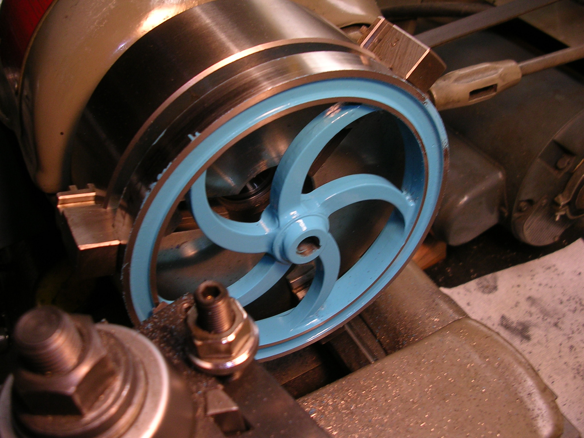 Machining flywheel rim after painting.